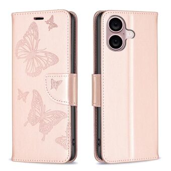 For iPhone 16 Embossing Two Butterflies Pattern Leather Phone Case(Rose Gold)