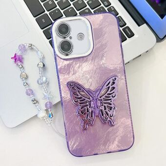 For iPhone 16 Plus Plating Glitter Lens Film Texture Butterfly Holder Wristband Phone Case(Purple Tinfoil Texture)