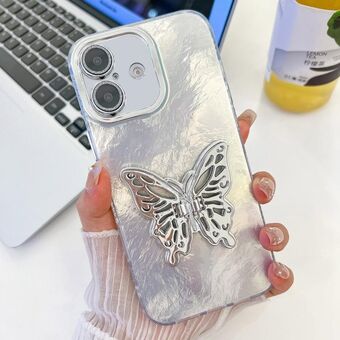 For iPhone 16 Plus Plating Glitter Texture Butterfly Holder TPU Phone Case with Lens Film(White Tinfoil Texture)