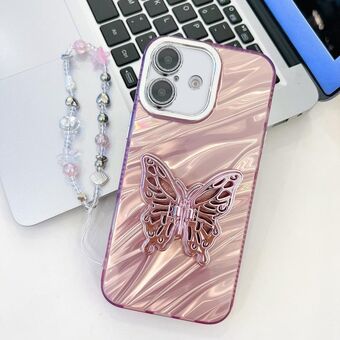 For iPhone 16 Plus Plating Glitter Lens Film Texture Butterfly Holder Wristband Phone Case(Pink Water Ripples)
