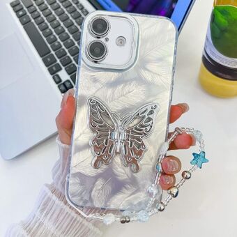 For iPhone 16 Plus Plating Glitter Lens Film Texture Butterfly Holder Wristband Phone Case(White Feathers)
