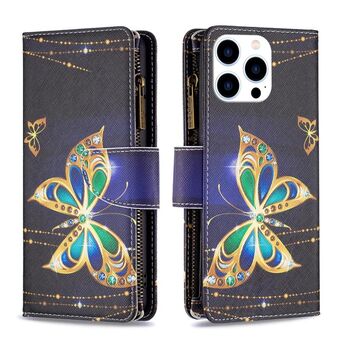 Θήκη τηλεφώνου από δέρμα με φερμουάρ και σχέδιο πολύχρωμης ζωγραφικής για iPhone 16 Pro (Μωβ Πεταλούδα)