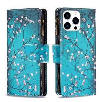 Θήκη δερμάτινη για iPhone 16 Pro με σχέδιο έγχρωμης ζωγραφικής και φερμουάρ (Λουλούδι Δαμασκηνιάς)