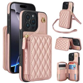 For iPhone 16 Pro AwQuer Crossbody Zipper Wallet Rhombic Leather Back Phone Case(Rose Gold) (Awquer)
