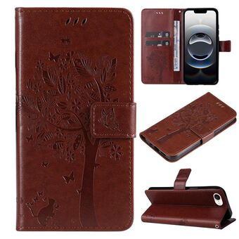 For iPhone 16e Tree & Cat Embossed Pattern Flip Leather Phone Case(Coffee)