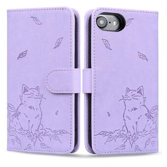 For iPhone 16e Cute Cat Embossed Leather Phone Case(Purple)