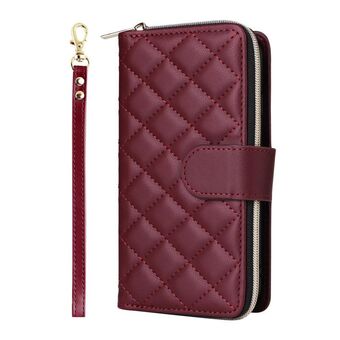 For iPhone 16e Crossbody Rhombic Zipper Tower Buckle Leather Phone Case with Lanyard(Wine Red)