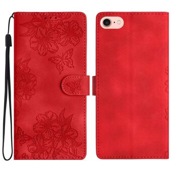 For iPhone 16e Cherry Blossom Butterfly Skin Feel Embossed PU Phone Case(Red)