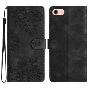 For iPhone 16e Cherry Blossom Butterfly Skin Feel Embossed PU Phone Case(Black)