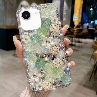 For iPhone 16e Rose Hand-set Pearl Diamond PC Phone Case(Green)