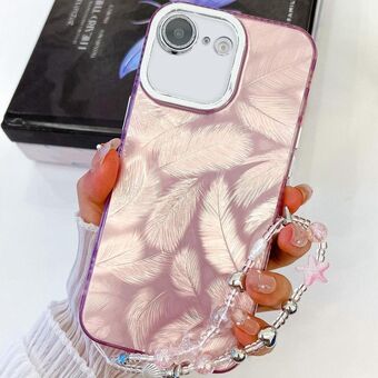 For iPhone 16e Plating Glitter Texture Chain Wristband TPU Phone Case with Lens Film(Pink Feathers)