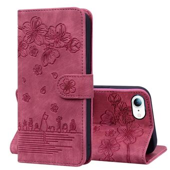 For iPhone SE 2022 / SE 2020 / 8 / 7 Cartoon Sakura Cat Embossed Leather Case(Rose Red)