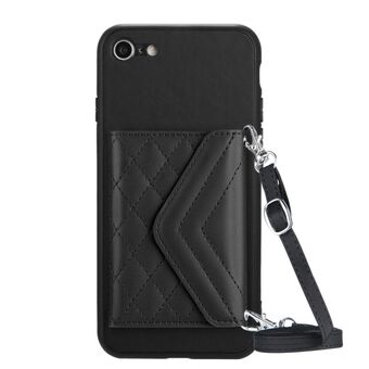 For iPhone SE 2022 / SE 2020 Rhombic Texture Card Bag RFID Phone Case with Long Lanyard(Black)