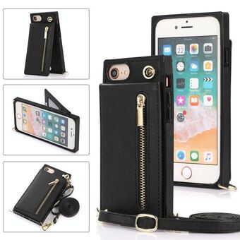 For iPhone SE 2022 / SE 2020 / 8 / 7 Cross-body Zipper Square TPU+PU Back Cover Case with Holder & Card Slots & Wallet & Strap(Black)