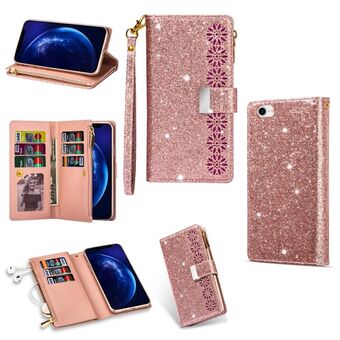 For iPhone SE 2022 / SE 2020 / 8 / 7 Multi-card Slots Starry Sky Laser Carving Glitter Zipper Horizontal Flip Leather Case with Holder & Wallet & Lanyard(Rose Gold)