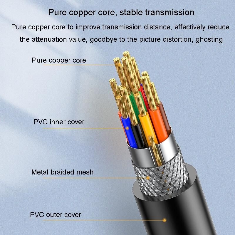 2. Πυρήνας σύρματος καθαρού χαλκού για βελτίωση της απόστασης μετάδοσης, σταθερή μετάδοση, αποτελεσματική μείωση της τιμής εξασθένησης, αποχαιρετισμός στην παραμόρφωση της εικόνας, διπλή εικόνα
