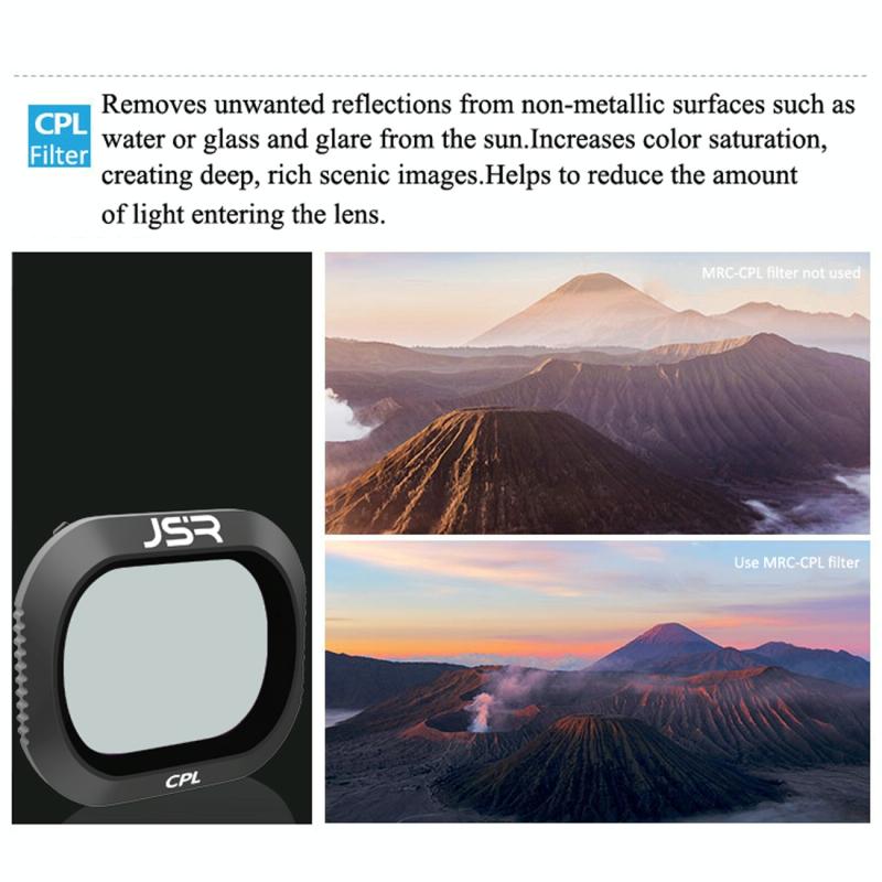 4. CPL filters increases color saturation, creating deep, rich scenic images. Helps to reduce the amount of light entering the lens. Removes unwanted reflections from non-metallic surfaces such as water or glass and glare from the sun.