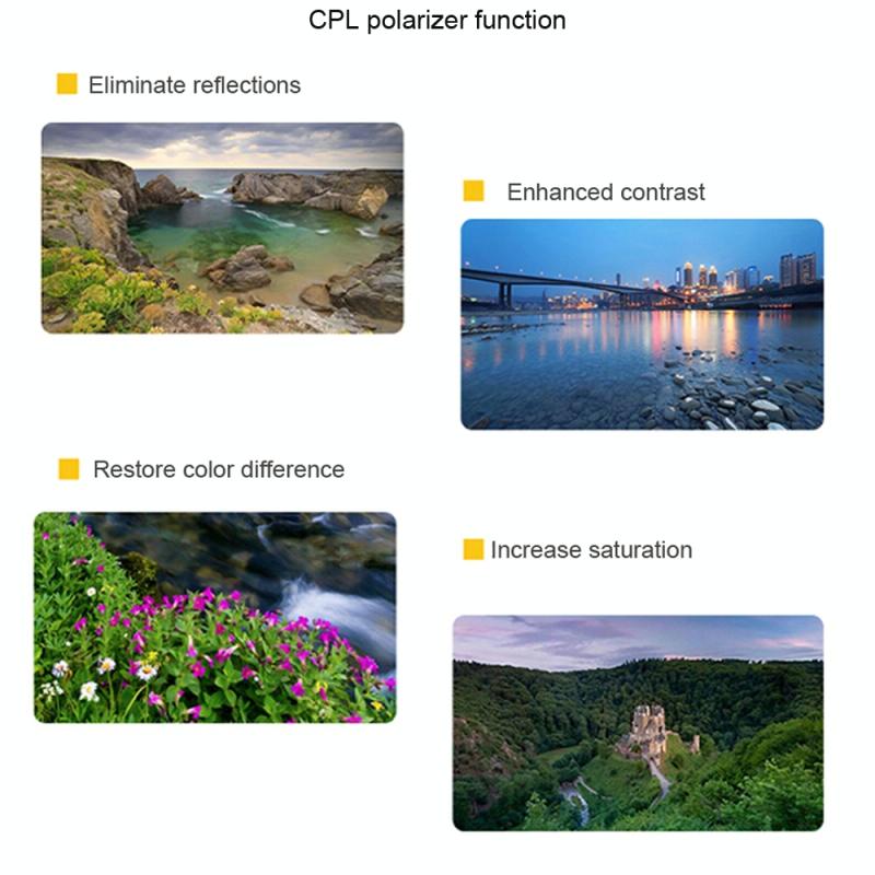 3. CPL filters increases color saturation, creating deep, rich scenic images. Helps to reduce the amount of light entering the lens. Removes unwanted reflections from non-metallic surfaces such as water or glass and glare from the sun.