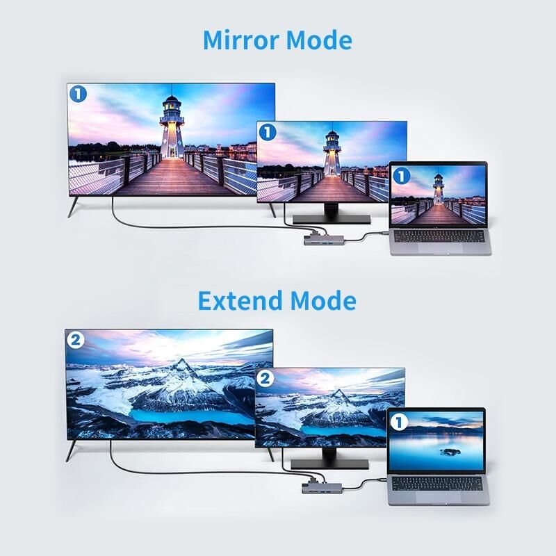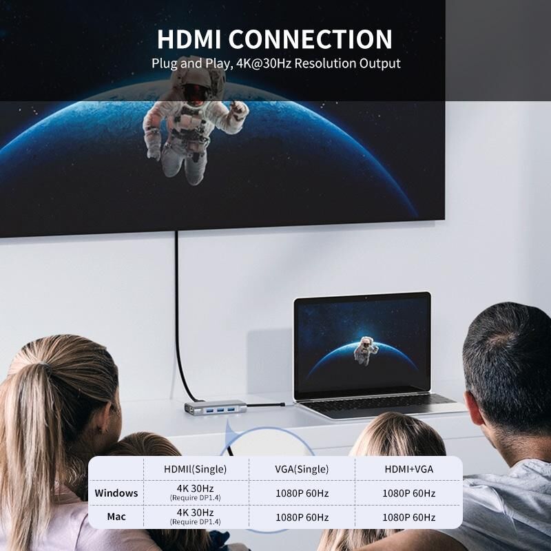 2. Κρυστάλλινη Έξοδος HDMI 4K: κάντε τη ζωή σας πιο πολύχρωμη - αντικατοπτρίστε ή επεκτείνετε την οθόνη σας με τη θύρα HDMI του προσαρμογέα USB C και μεταδώστε απευθείας βίντεο 4K UHD ή Full HD 1080P σε HDTV, οθόνες ή προβολείς για μια κινηματογραφική εμπειρία. Όταν οι θύρες εξόδου HDMI και VGA λειτουργούν ταυτόχρονα, η μέγιστη ανάλυση οθόνης και των δύο θυρών είναι 1080P.
