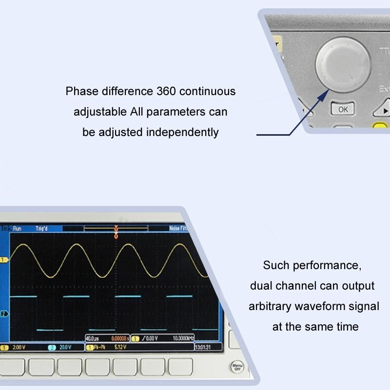 32. The dual channels with equal performance can output the same or different function signals or arbitrary waveform signals at the same time. All parameters can be adjusted independently. The phase difference between the two channels is continuously adjustable from 0 to 359.9 degrees
