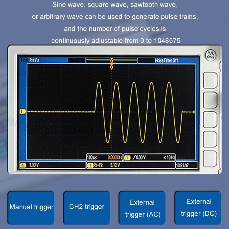33. Sine wave, square wave, sawtooth wave, or arbitrary wave can be used to generate pulse trains. The number of pulse cycles is continuously adjustable from 0 to 1048575
