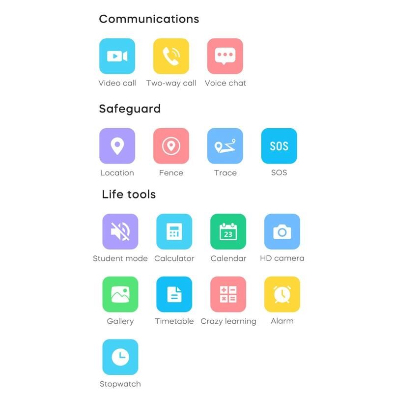 5. Περισσότερες λειτουργίες: φωνητική συνομιλία/άλμπουμ/χρονόμετρο/ξυπνητήρι/λειτουργία τάξης/υπολογιστής/ημερολόγιο/SOS/ιχνηλάτης διαδρομής/πολλαπλός εντοπισμός θέσης/ασφαλής περιοχή