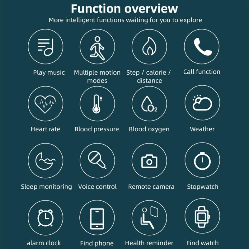 1. Υποστήριξη συγχρονισμού APP, απάντηση κλήσεων, άγγιγμα για απόρριψη κλήσεων, άγγιγμα για εκκίνηση φωνητικού βοηθού, ώθηση πληροφοριών, καρδιακός ρυθμός, αρτηριακή πίεση, οξυγόνο αίματος, λειτουργία πολλαπλών αθλημάτων, συνεχής καρδιακός ρυθμός, αναζήτηση κινητού τηλεφώνου, υπενθύμιση μηνυμάτων, αποθήκευση μηνυμάτων, συγχρονισμός ώρας, αναπαραγωγή μουσικής, απομακρυσμένο χειριστήριο κάμερας, παρακολούθηση κατανάλωσης νερού, παρακολούθηση καθιστικής ζωής, παρακολούθηση ύπνου, βηματομετρητής, αναζήτηση βραχιολιού, ρύθμιση ξυπνητηριού, χρονόμετρο, ρύθμιση φωτεινότητας οθόνης, ρύθμιση καντράν, ανύψωση χεριού για φωτισμό οθόνης, ήχος προτροπής ακουστικών