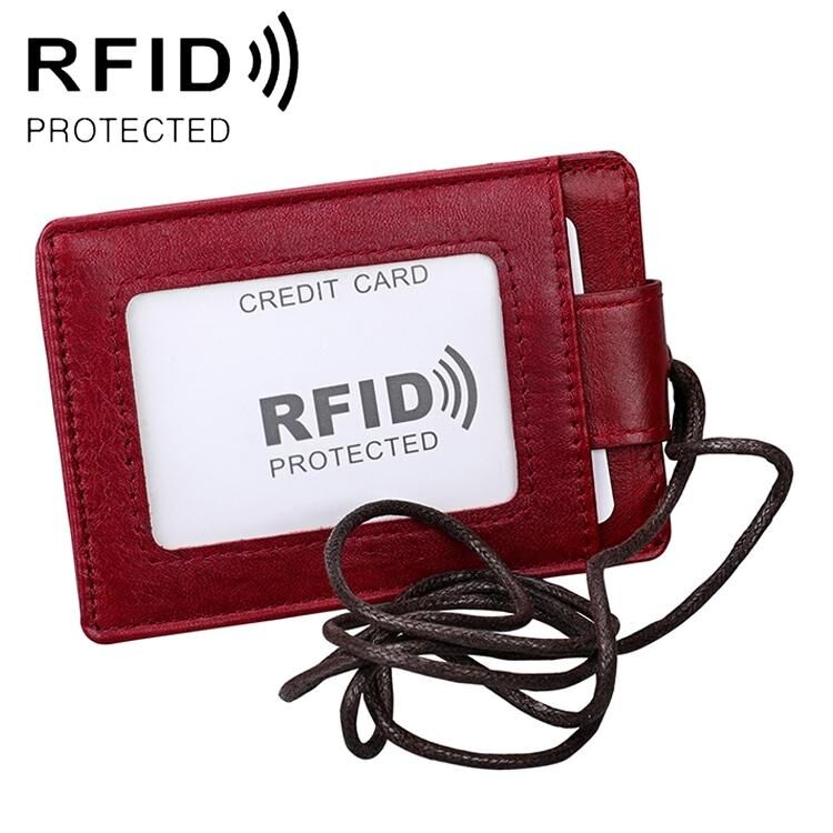 KB153 Antimagnetic RFID Leather Card Holder ID Card Badge with Lanyard(Red)