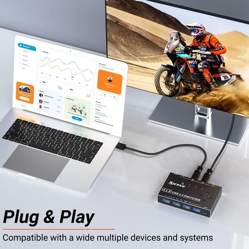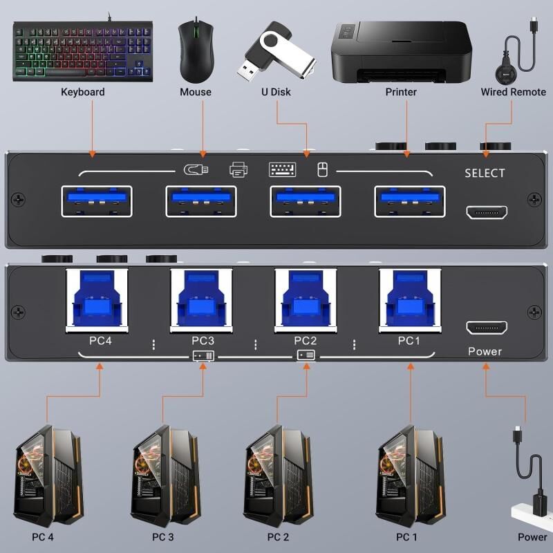 1. Allows switching between 4 computers using a push-button switch or wired remote control to share 4 USB peripherals without having to constantly pull cables or set up complicated network sharing software