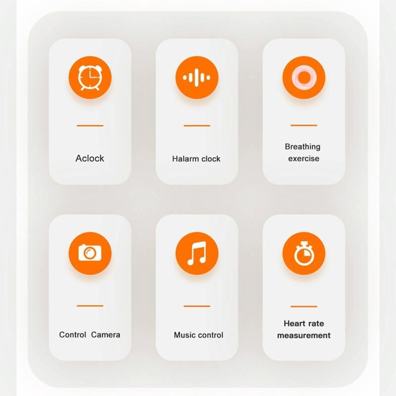 13. Functions: voice call, small games, intelligent split screen display, customized dial, sports modes, water drinking reminder, breathing training, sleep monitoring, heart rate/blood pressure/blood oxygen monitoring, call reminder, message reminder, sedentary reminder, alarm clock, stopwatch, calculator, looking for the bracelet, raise to wake