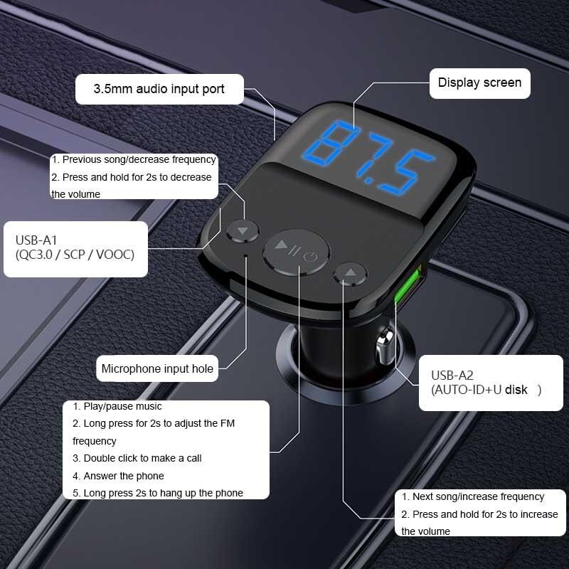 3. USB-A1 output: 3.5-3.6A, 5.5V/3.6A, 9V/2A, 12V/1.5A (20W)