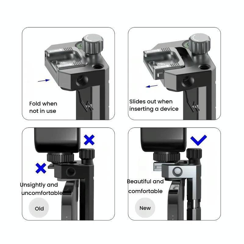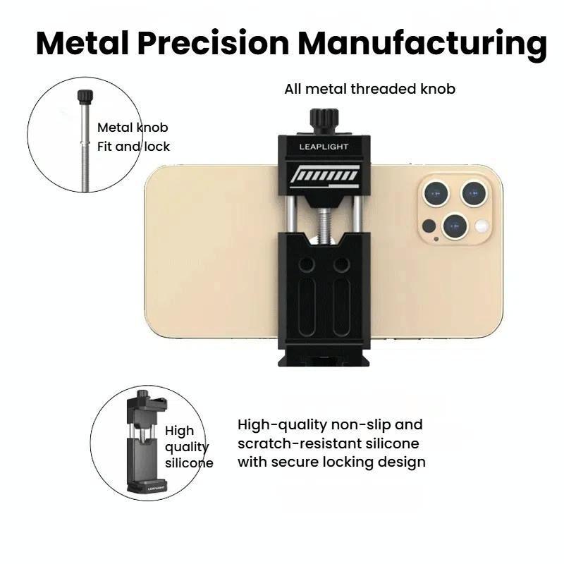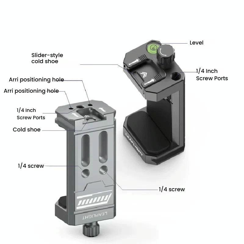 1. Βάση Κινητού Διπλής Ψυχρής Υποδοχής Πολλαπλών Διεπαφών από Κράμα: Μια επαγγελματική σφιγκτήρας από κράμα αλουμινίου σχεδιασμένη για δημιουργία περιεχομένου για κινητά, συμπεριλαμβανομένης της ζωντανής μετάδοσης, της κινηματογράφησης, της χρονοκαταγραφής και της παραγωγής vlog. Συμβατή με ένα ευρύ φάσμα αξεσουάρ όπως τρίποδα, σταθεροποιητές, βάσεις φωτισμού, μικρόφωνα και άλλα.