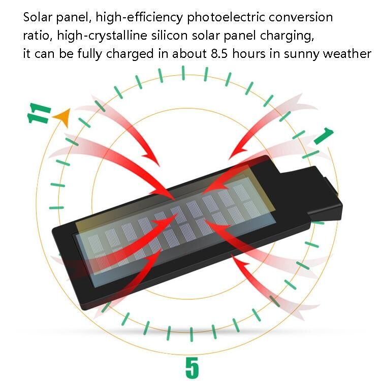1. Ηλιακό πάνελ, υψηλή απόδοση φωτοηλεκτρικής μετατροπής, φόρτιση ηλιακού πάνελ υψηλής κρυσταλλικής πυριτίου, μπορεί να φορτιστεί πλήρως σε περίπου 8.5 ώρες σε ηλιόλουστες καιρικές συνθήκες