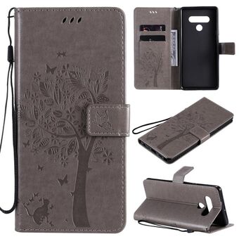 For LG Stylo 6 Tree & Cat Embossed Pattern Horizontal Flip Leather Case with Holder & Card Slots & Wallet & Lanyard(Gray)