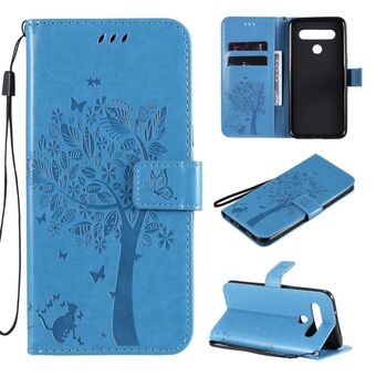 For LG K61 Tree & Cat Embossed Pattern Horizontal Flip Leather Case with Holder & Card Slots & Wallet & Lanyard(Blue)