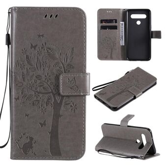 For LG K61 Tree & Cat Embossed Pattern Horizontal Flip Leather Case with Holder & Card Slots & Wallet & Lanyard(Gray)