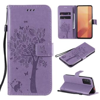 For Huawei Honor X10 5G Tree & Cat Embossed Pattern Horizontal Flip Leather Case with Holder & Card Slots & Wallet & Lanyard(Light Purple)