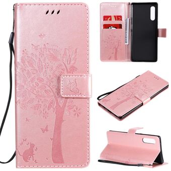 For LG K51 Tree & Cat Embossed Pattern Horizontal Flip Leather Case with Holder & Card Slots & Wallet & Lanyard(Pink)