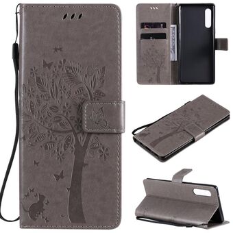 For LG K51 Tree & Cat Embossed Pattern Horizontal Flip Leather Case with Holder & Card Slots & Wallet & Lanyard(Gray)