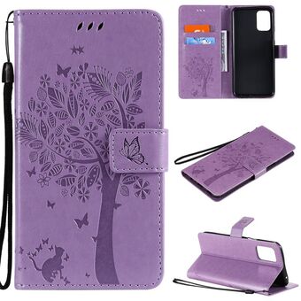For LG K52 Tree & Cat Pattern Pressed Printing Horizontal Flip PU Leather Case with Holder & Card Slots & Wallet & Lanyard(Light Purple)