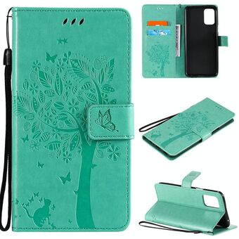 For LG K52 Tree & Cat Pattern Pressed Printing Horizontal Flip PU Leather Case with Holder & Card Slots & Wallet & Lanyard(Green)