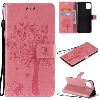 For LG K42 Tree & Cat Pattern Pressed Printing Horizontal Flip PU Leather Case with Holder & Card Slots & Wallet & Lanyard(Pink)