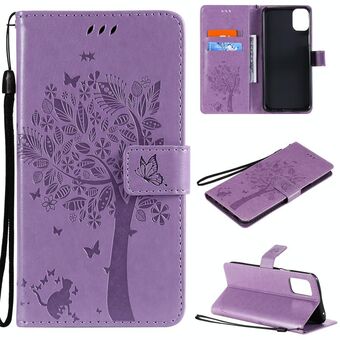 For LG K42 Tree & Cat Pattern Pressed Printing Horizontal Flip PU Leather Case with Holder & Card Slots & Wallet & Lanyard(Light Purple)