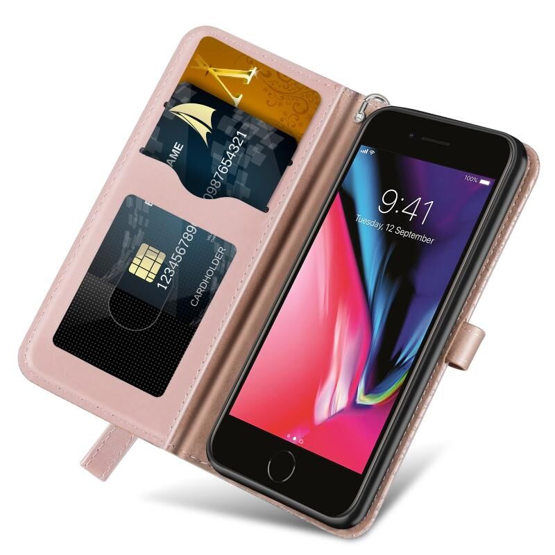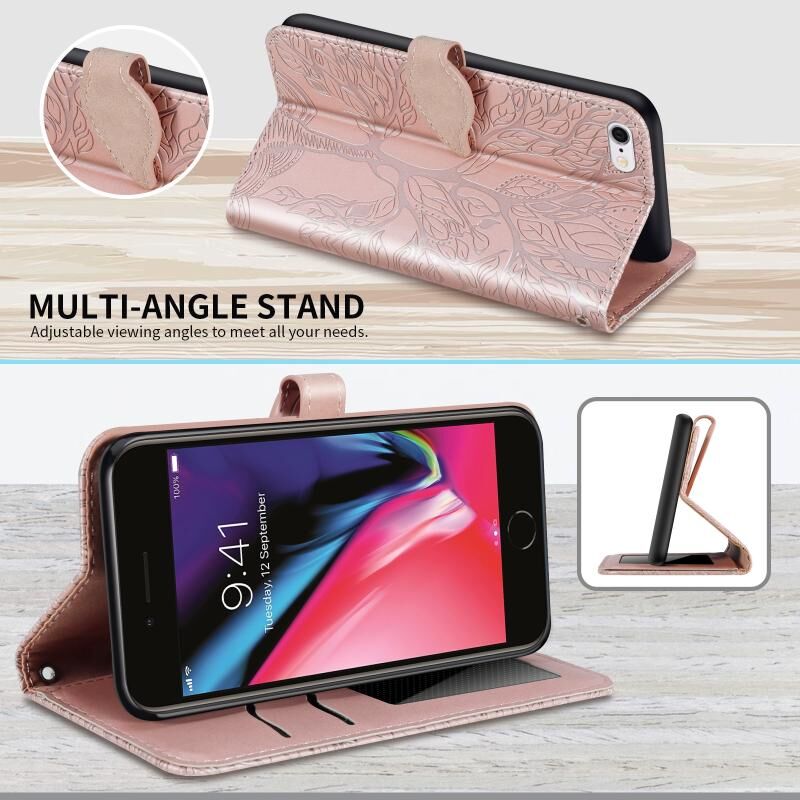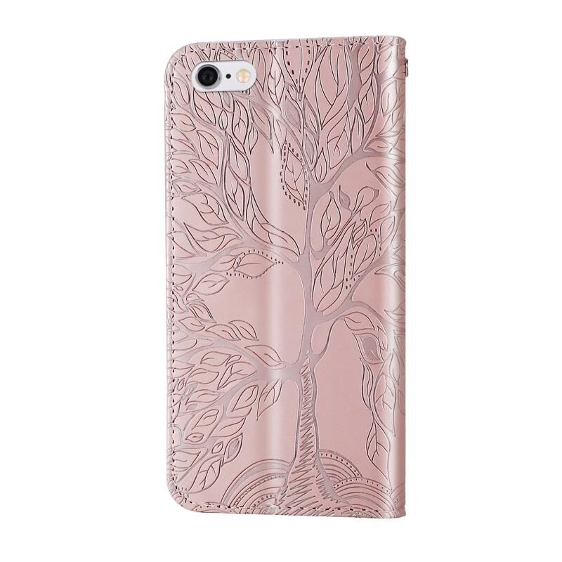 Θήκη δέρματος με ανάγλυφο σχέδιο "Δέντρο Ζωής", οριζόντιο άνοιγμα, με βάση, θήκη καρτών, πορτοφόλι, κορνίζα φωτογραφιών & λουρί για iPhone 6 & 6s (Χρυσό Ρόδι)
