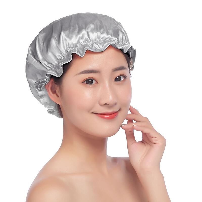 Lovely Thick Women Satin Colorful Double Waterproof Hair Cover Bathing Cap(Grey)
