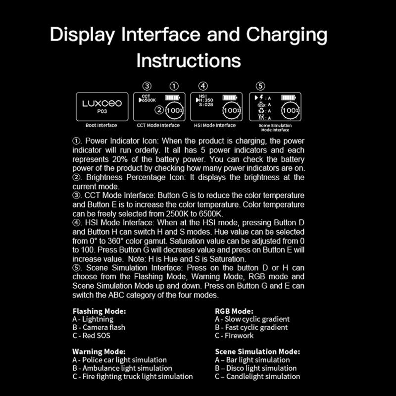 5. 12 kinds of scene simulation: Thunder flash, paparazzi flash, red light SOS, RGB slow cycle gradient, RGB fast cycle gradient, fireworks, police car mode, ambulance mode, fire truck mode, quiet scene, disco scene, candlelight scene