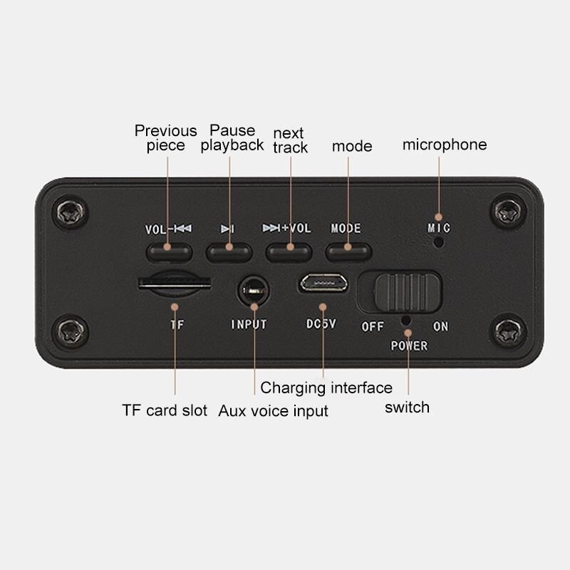 11. Connection method: Bluetooth, AUX input, TF card, FM