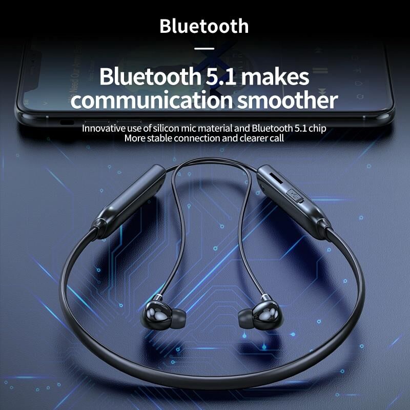 Ασύρματα ακουστικά Bluetooth 5.1 με ήχο Surround 8D, τοποθέτηση στον λαιμό, υποστήριξη κάρτας TF και λειτουργία MP3 (Μαύρο)