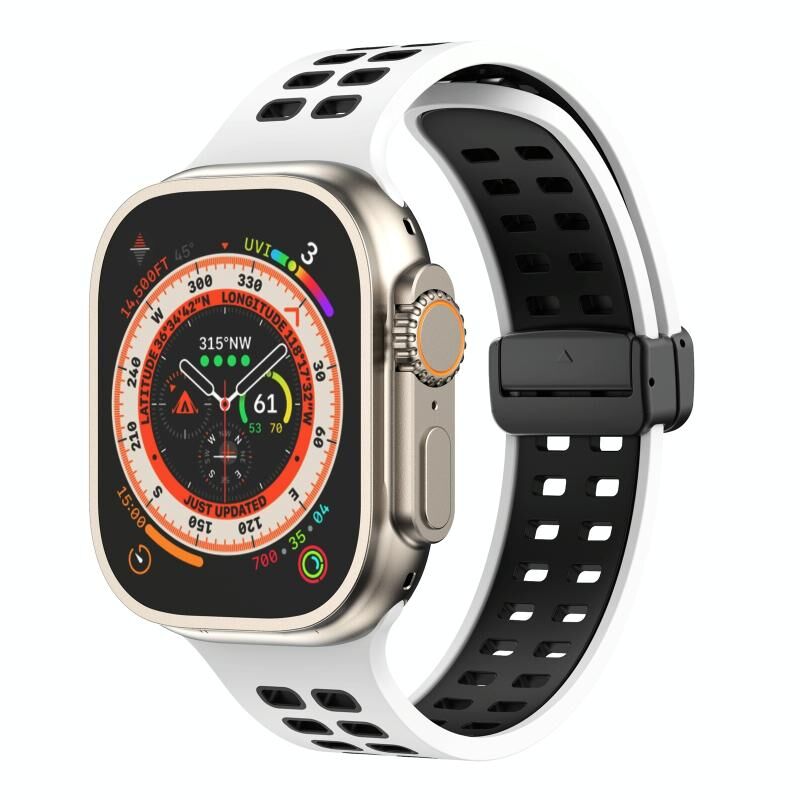 Μαγνητικό Κλείσιμο Δίπλωσης, Τετράγωνες Οπές, Λουράκι Σιλικόνης για Apple Watch Ultra 49mm & Watch Ultra 2 49mm / Series 9 & 8 & 7 45mm / SE 3 & SE 2 & 6 & SE & 5 & 4 44mm / 3 & 2 & 1 42mm (Λευκό, Μαύρο)