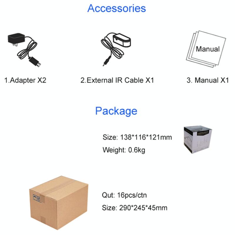 6. Support infrared expansion, you can use the remote control to control the playback of the set-top box or player playback, pause or menu selection on the remote TV.